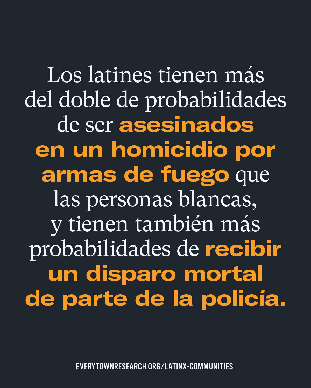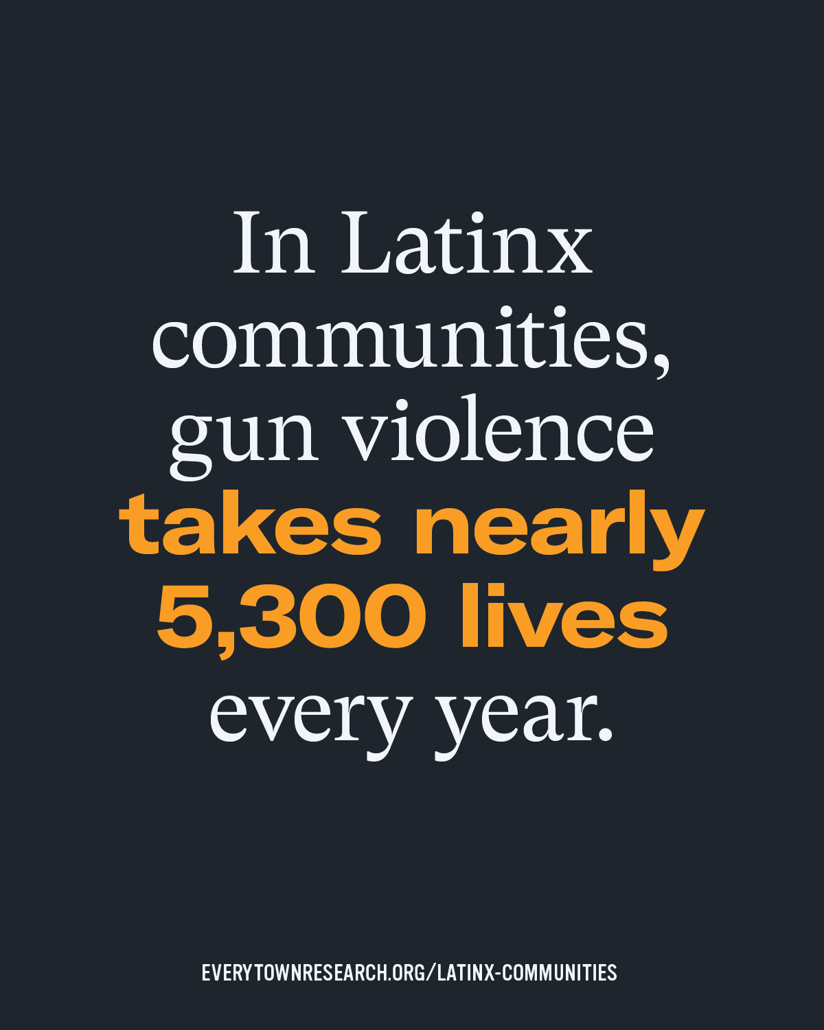 For too many years, Latinx communities have borne some of the heaviest burdens of gun violence, dying from gun violence every day and at rates disproportionate to their white peers. Systemic inequities across institutions and generations of racial discrimination have exacerbated this crisis to target communities of color, including Latinx communities. Whether it be through hate-motivated violence, city gun violence, police violence, or firearm suicide, Latinx communities remain among the most severely threatened groups.